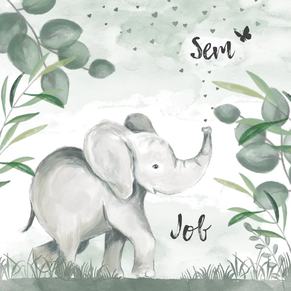 Avontuurlijke kinder-rouwkaart voor tweeling waarvan één kindje is overleden, met een olifant van waterverf. Tweelingkaart voor een vlinderkindje