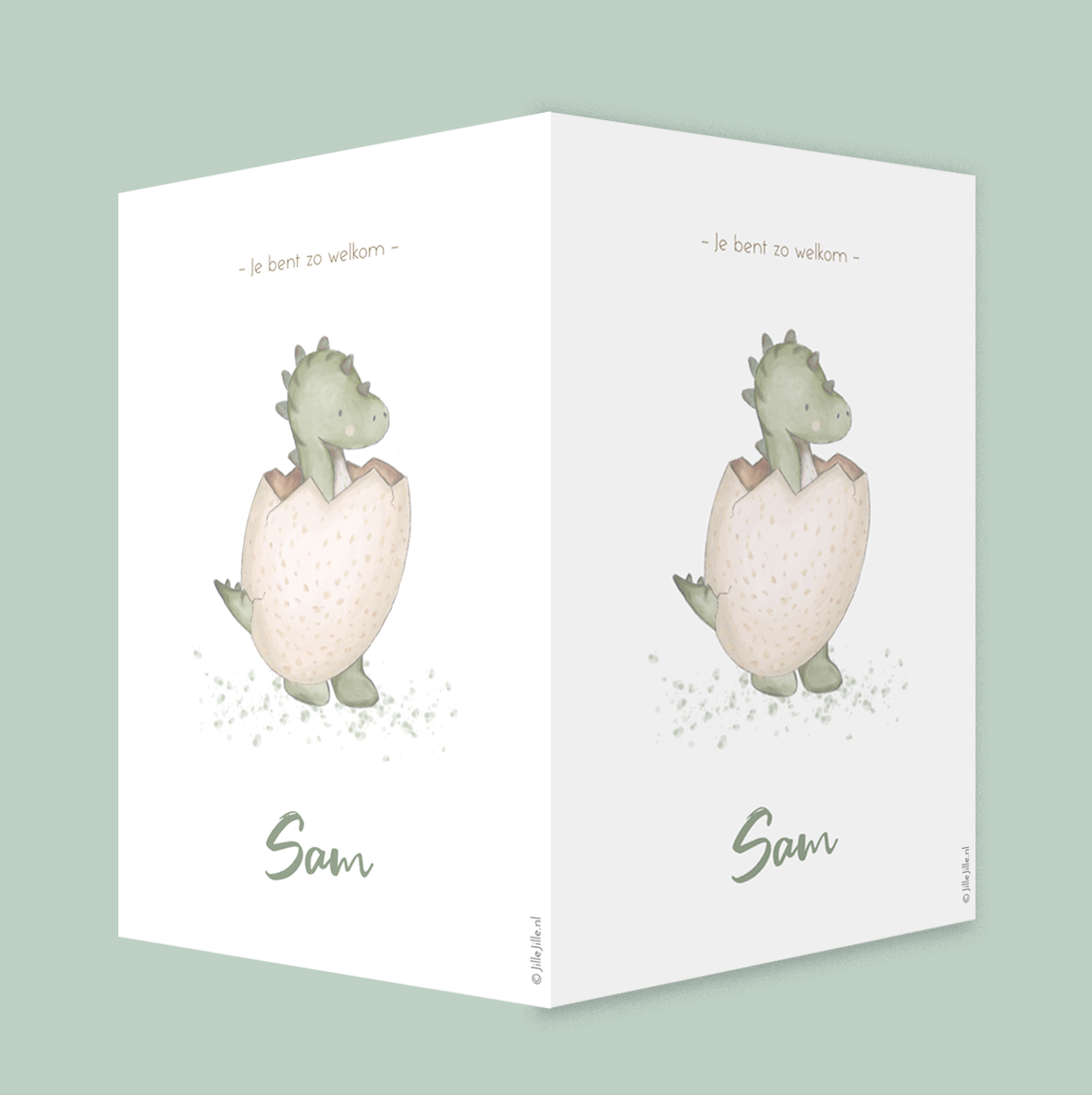 Een super lief unisex geboortekaartje met een draakje wat uit een eitje komt kruipen. Dit leuke makelaarsbord met een dinosaurus (of draakje) past bij het geboortekaartje met een dino.