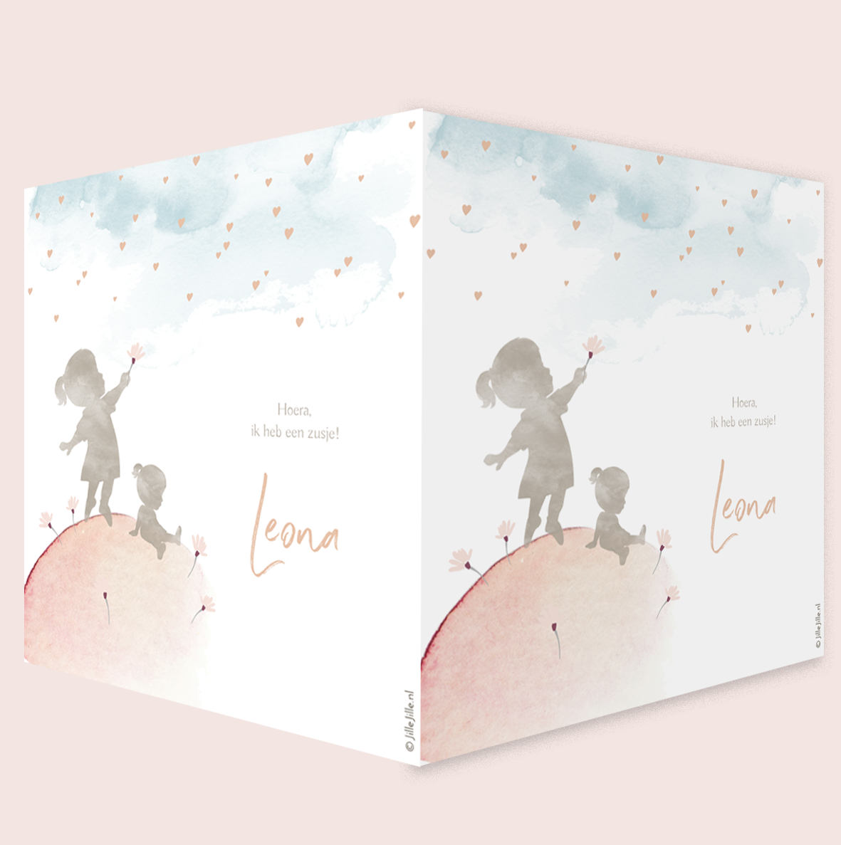 Een lief makelaarsbord of raambord dubbel met de silhouetten van twee zusjes op een aquarel wereldbol met bloemetjes en de hemel vol met kleine hartjes. Welkom lief zusje! Door het silhouet aan te passen met onze afbeeldingen kun je er een ouder broertje bijzetten of een derde kindje etc.