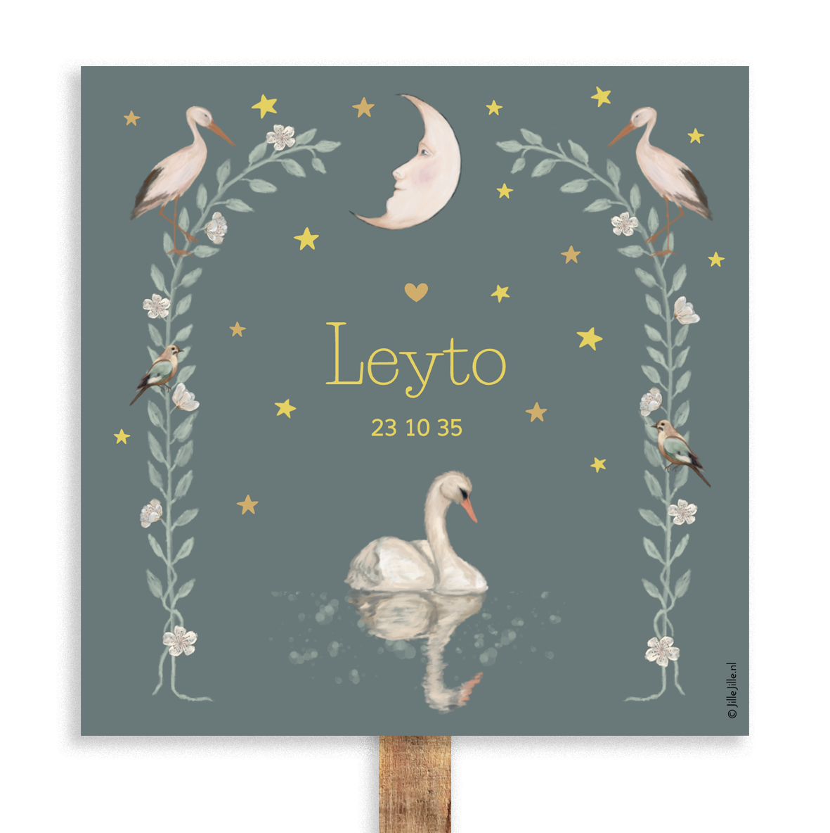 Met dit leuke tuinbord kondig je de geboorte van jullie kindje aan, de hele buurt mag het weten. Op dit tuinbord wat past bij een van onze geboortekaartjes staan illustraties van een zwaantje, maan en ooievaar op takjes en met sterretjes en vogeltjes