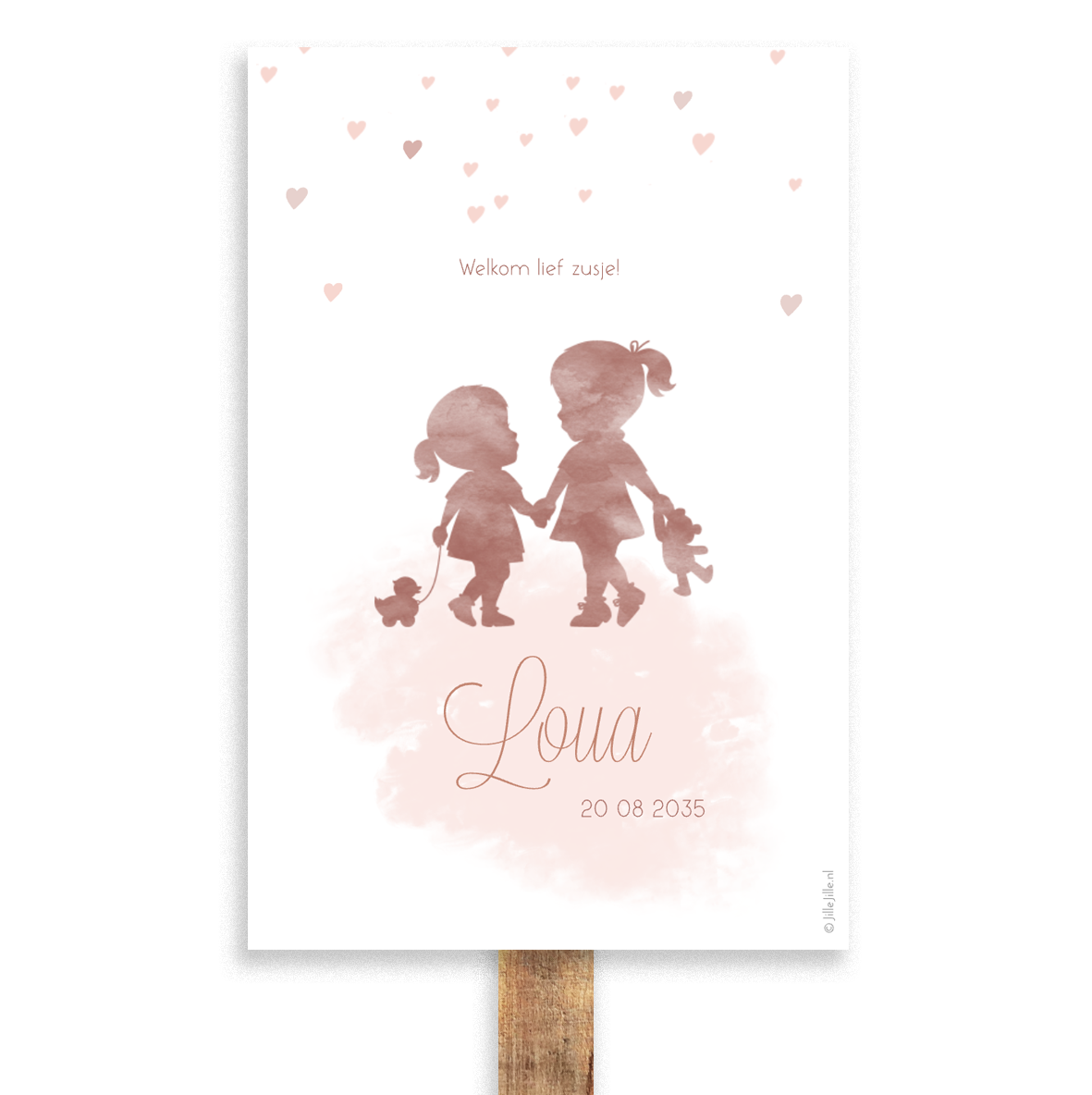 Kondig de geboorte van jullie kindje aan met een leuk tuinbord in de stijl van je geboortekaartje. Twee kleine zusjes silhouet in waterverf hand in hand.