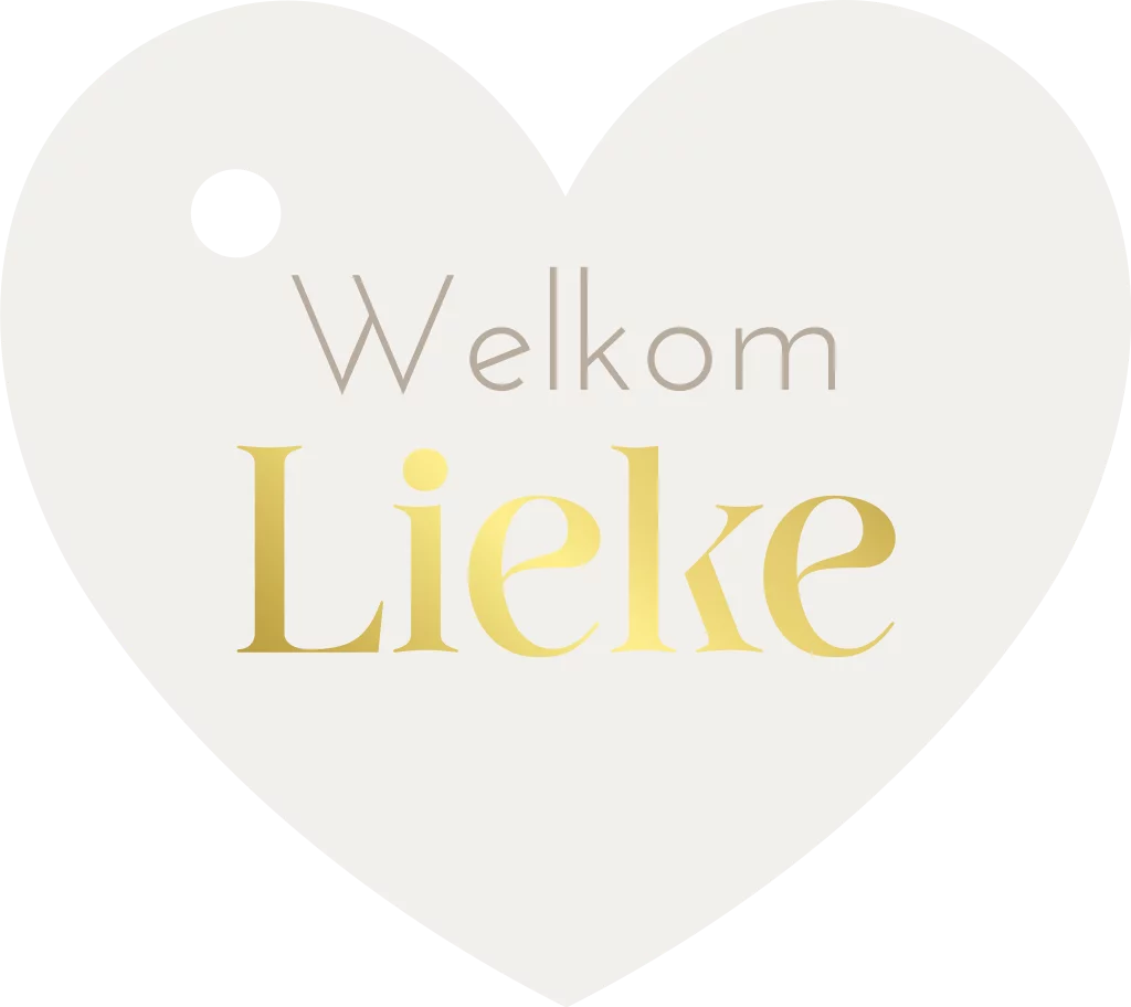 Een super leuk labeltje in de vorm van een hartje met de naam van jullie kindje in goudfolie gedrukt. Dit labeltje met een gaatje, kun je zelf ontwerpen en is 4 x 4.5 cm. Bewerk dit hart labeltje in onze online editor en maak het naar je eigen idee zodat het leuk bij jouw kaartje past.