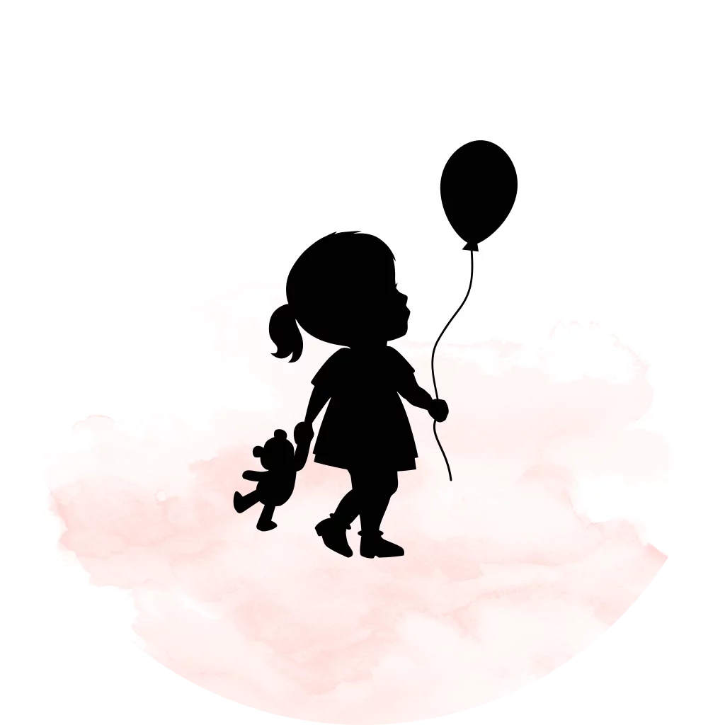 Sluitsticker met het silhouet van een meisje met beertje en ballon en waterverf. Deze sluitzegel kun je zelf aanpassen.