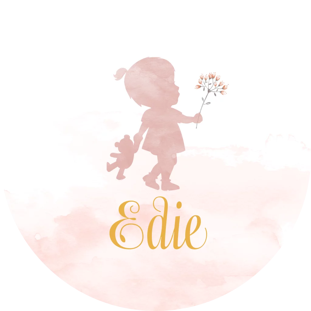 Leuke sluitsticker met waterverf silhouet van een meisje met een bloem in haar hand en de naam