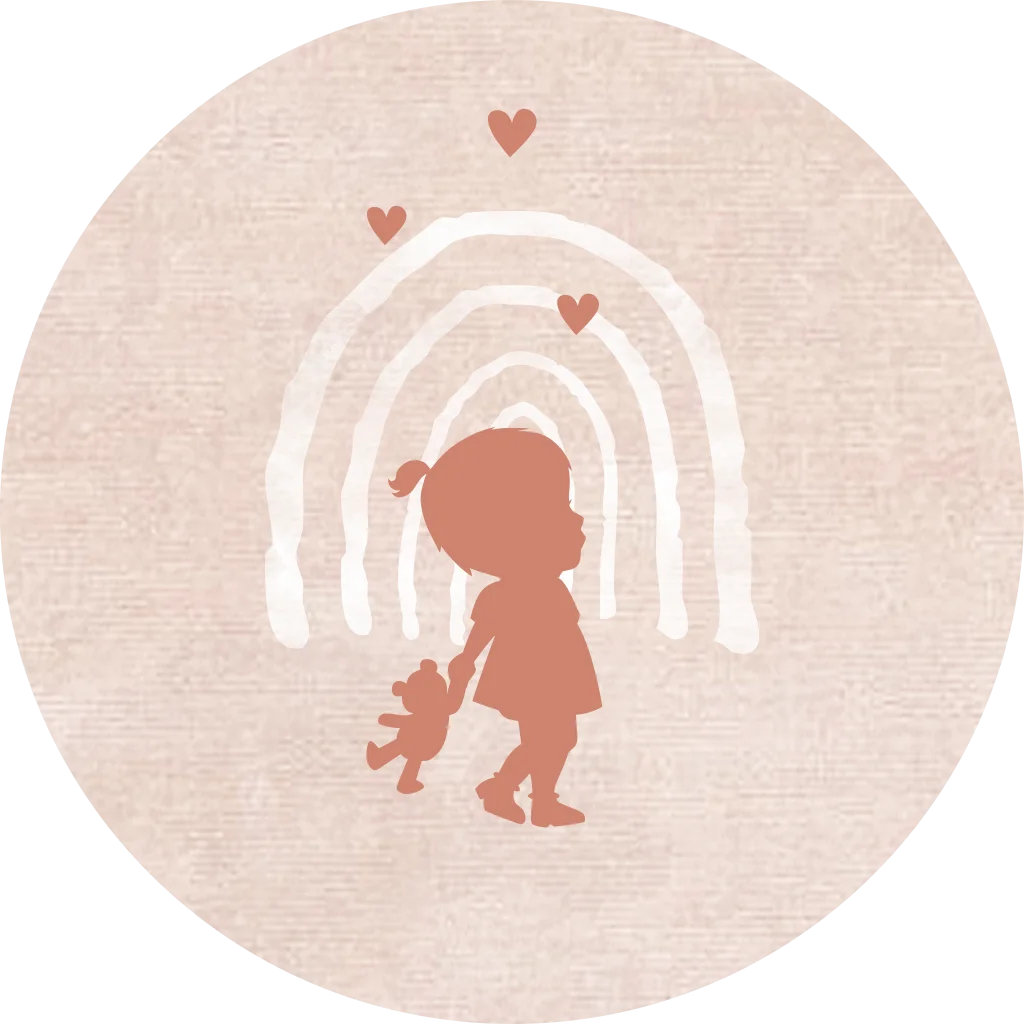 Sluitsticker met een silhouet van een dochtertje met een beertje, een regenboog en kleine hartjes.