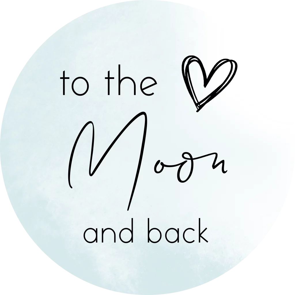 Sluitsticker met de tekst to the moon and back. De teksten en kleuren van deze sluitzegel kun je zelf aanpassen.