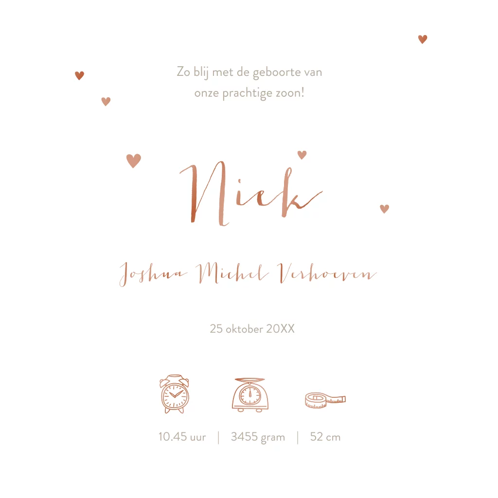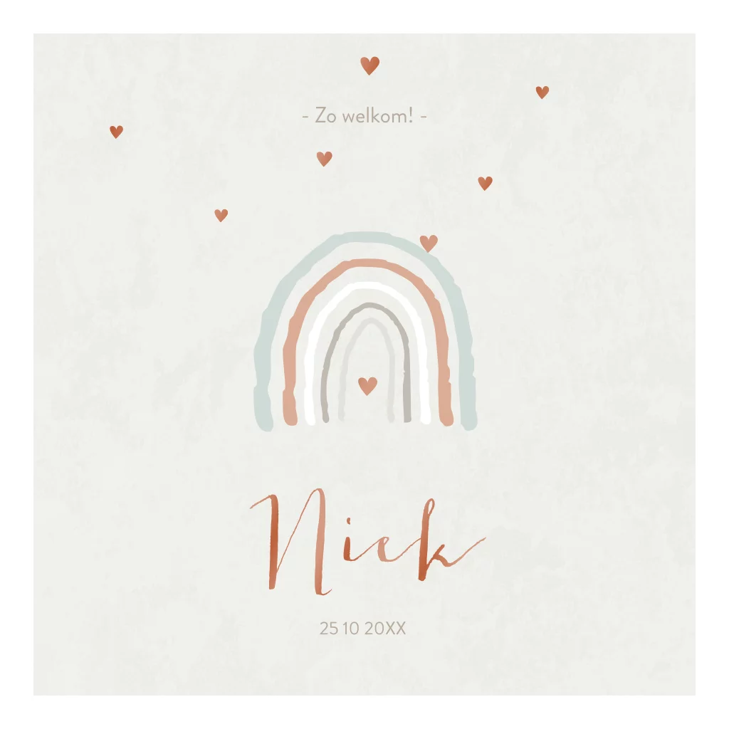 Mooie geboortekaart met hoogglans teksten en hartjes en regenboog in pastelkleuren. Zet deze babykaart eenvoudig om naar goudfolie, zilverfolie of roséfolie.