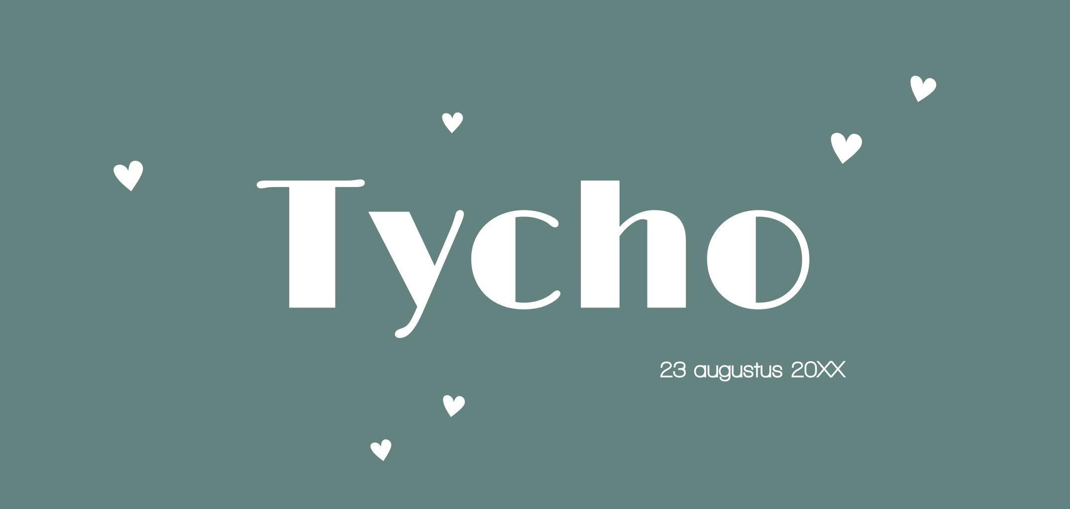 Stoere liggende geboortekaart met ronde hoeken en de naam en hartjes in zwart foliedruk.