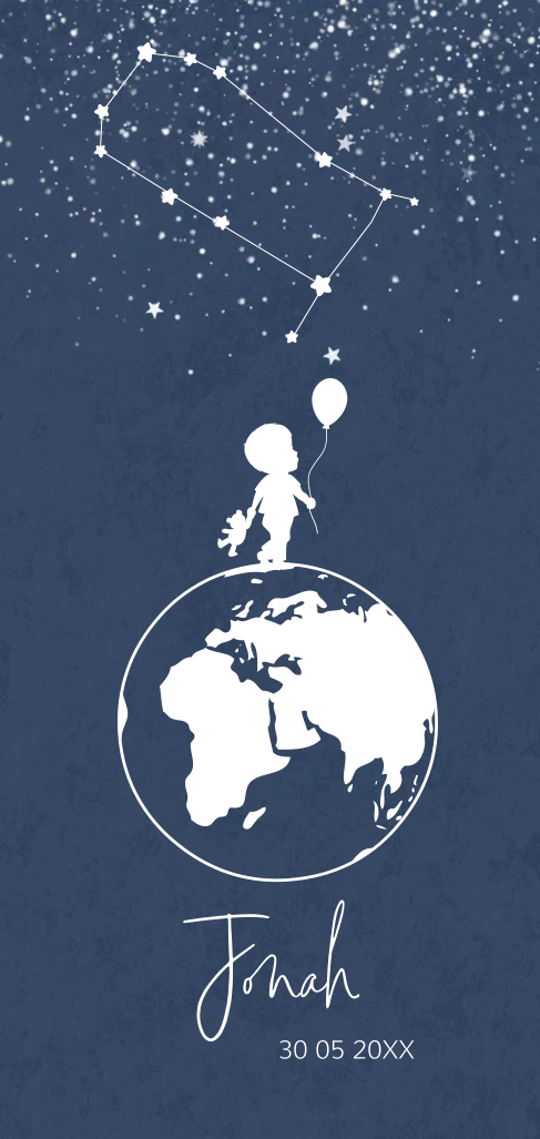 Mooie staande geboortekaart met goudfolie en silhouet van een jongetje op de wereldbol met zijn sterrenbeeld in de sterrenhemel.