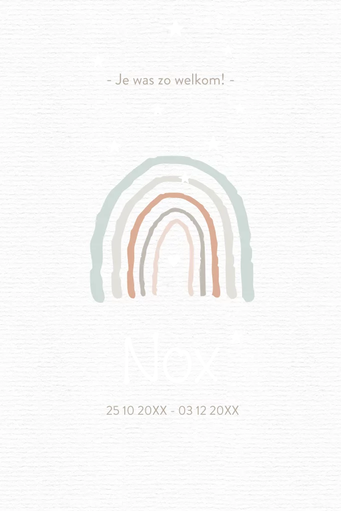 Lief rouwkaartje met echt zilver foliedruk en een regenboog in pastelkleuren. Dit baby-rouwkaartje is geschikt voor een jongetje of een meisje.