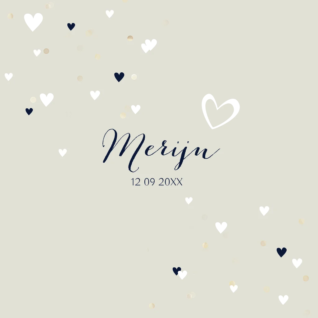 Lief goudfolie geboortekaartje met dwarrelende hartjes. Deze mooie geboortekaart kun je zelf personaliseren door o.a. de kleuren, teksten en afbeeldingen aan te passen.