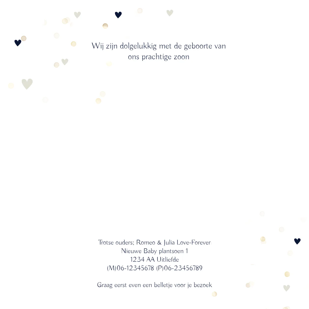 Lief folie geboortekaartje zoontje met hartjes confetti