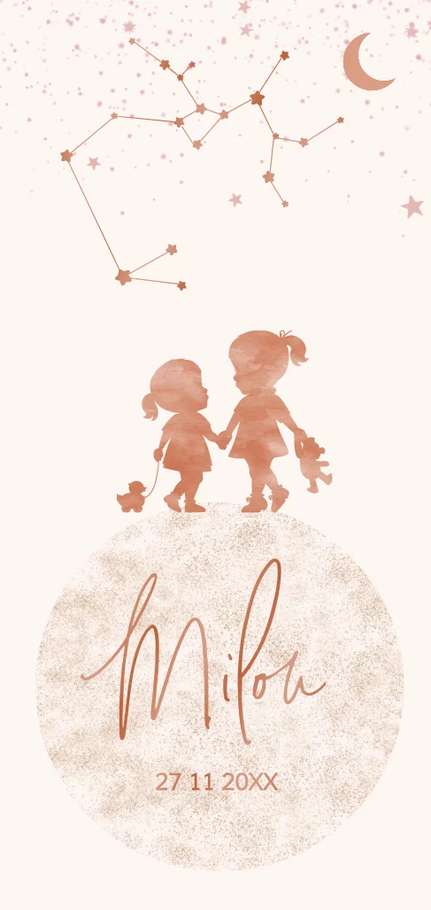 Mooie staande geboortekaart met hoogglans elementen en silhouet van een meisje met grote zus op de wereldbol met haar sterrenbeeld in de sterrenhemel.