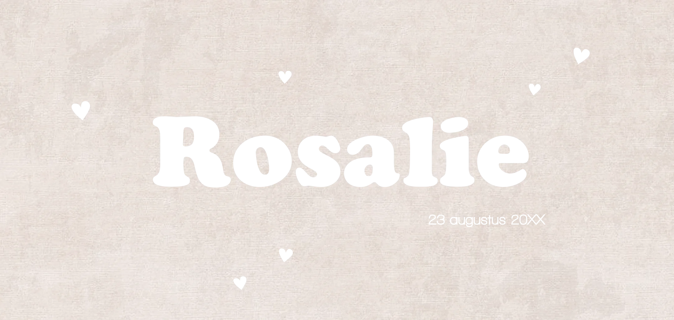 Typografie geboortekaart met de naam en kleine hartjes in roséfolie op een velvet-achtige gestructureerde achtergrond en ronde hoeken.