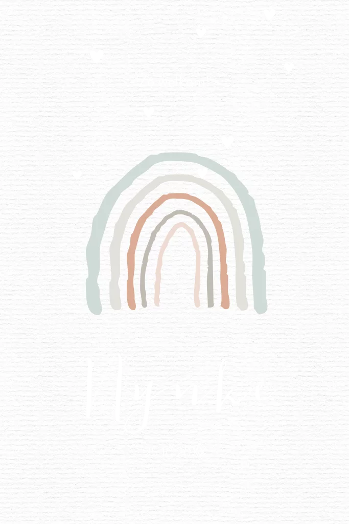 Hippe unisex geboortekaart met een regenboog in pastelkleuren en kleine hartjes in rosé foliedruk. Pas zelf eenvoudig de teksten aan of verander de achtergrond en zet om naar goudfolie, zilverfolie of koperfolie.