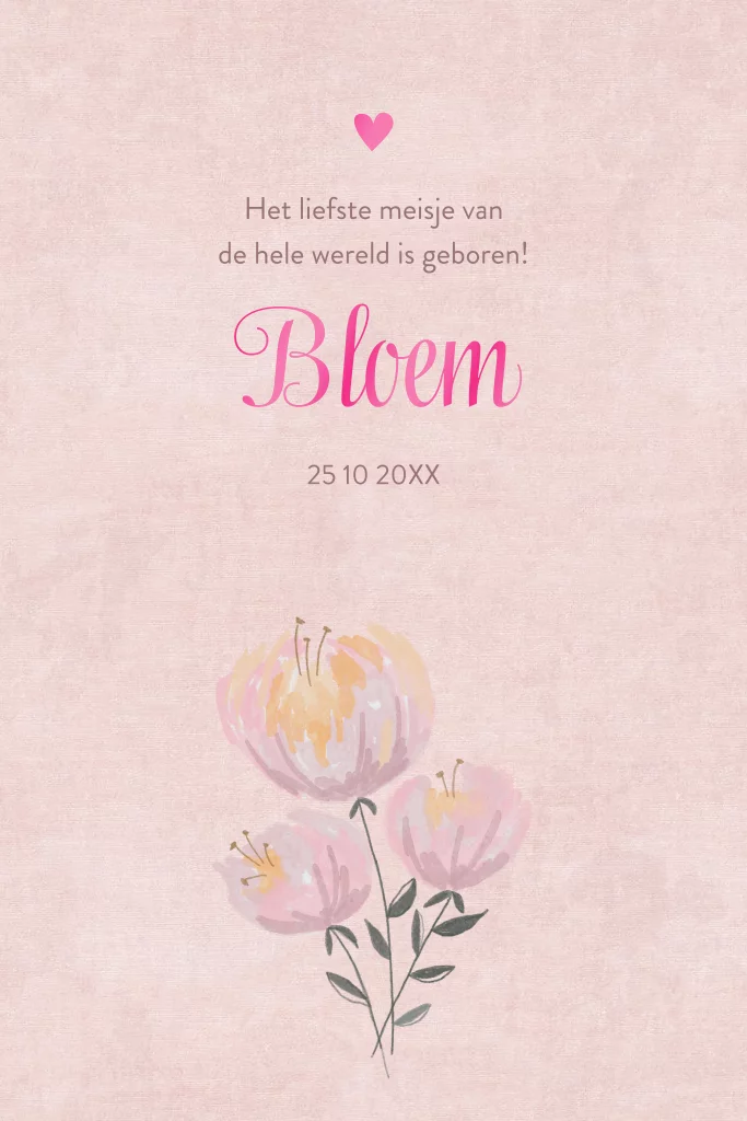 Mooie vrolijke geboortekaart met de naam in fel roze hoogglans lak op een achtergrond van zacht roze en geschilderde bloemetjes en ronde hoeken.