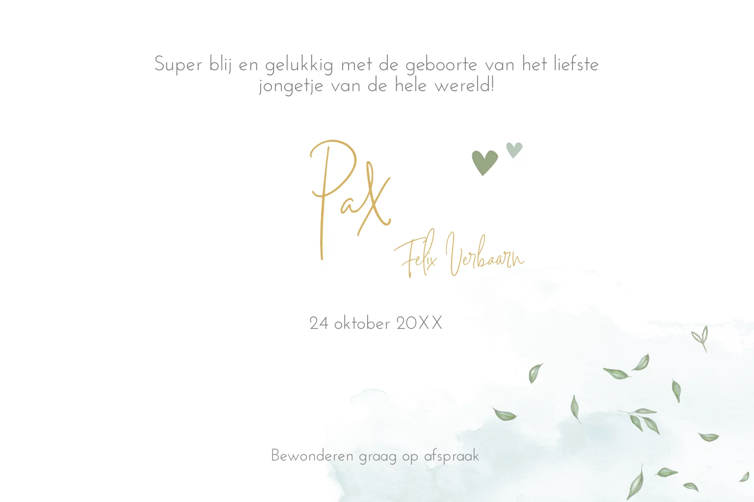 Deze mooie geboortekaart met de naam in goudfolie en dwarrelende blaadjes op waterverf kun je zelf personaliseren door de kleuren aan te passen of silhouetten toe te voegen uit de beeldbank. Let op; deze kaart heeft een langere verzendtijd: voor 18.00 uur besteld = de volgende werkdag gedrukt en verzonden. Vanaf 5 stuks.