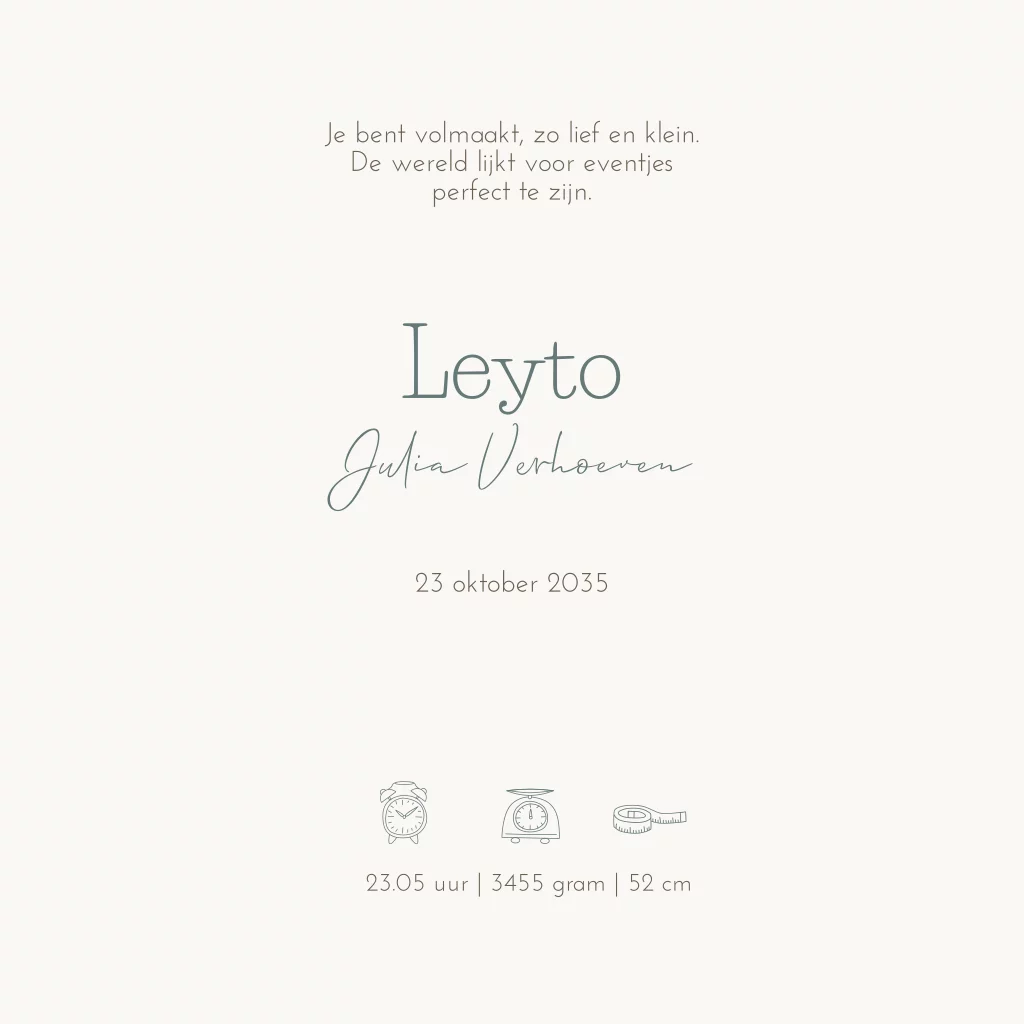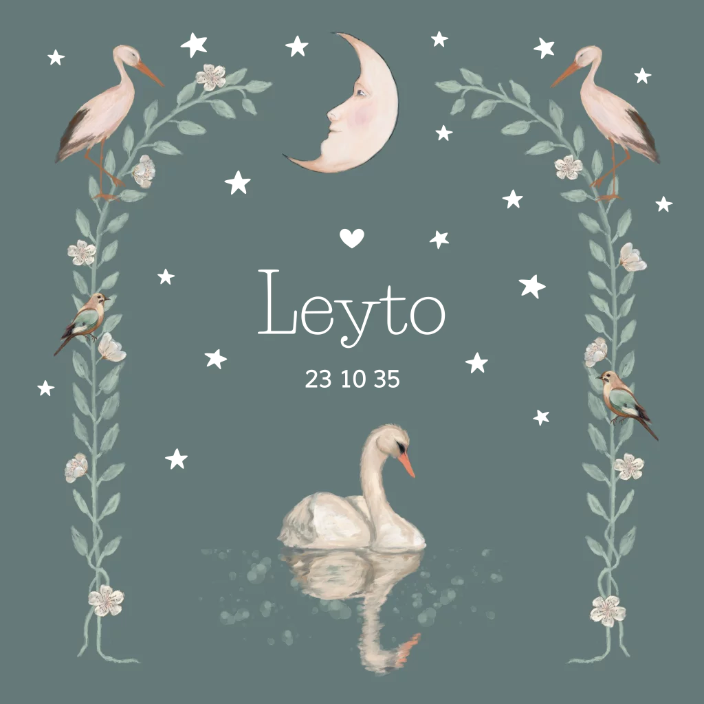 Een super mooi geboortekaartje met een lief geschilderd zwaantje, een maan, een ooievaar en kleine vogeltjes op een tak met bloemetjes. De naam en sterretjes en de geboortedatum zijn hier met goudfolie gedrukt. Dit leuke babykaartje maak je helemaal eigen door de kleuren van de achtergrond, de tekst en het lettertype aan te passen.