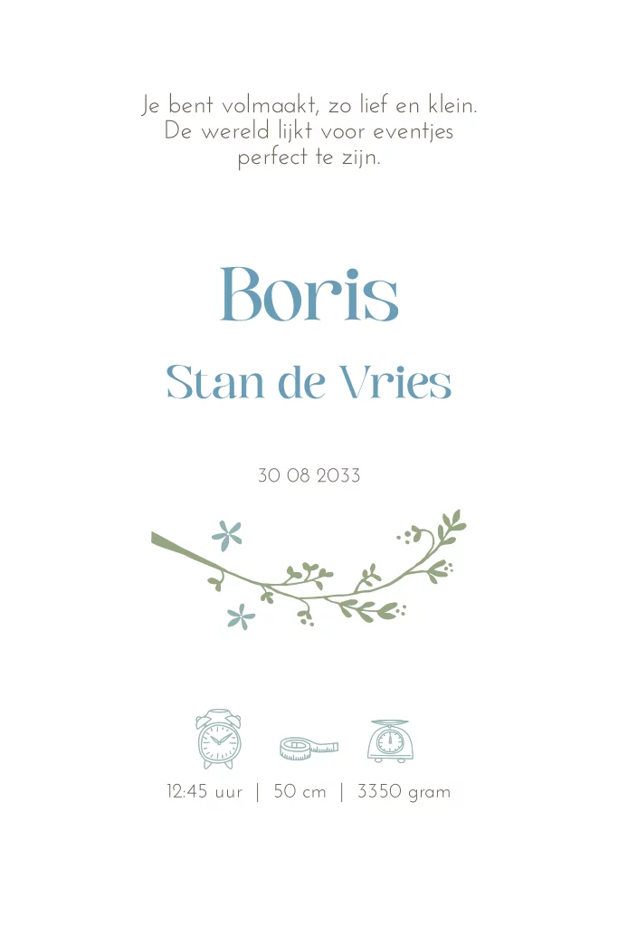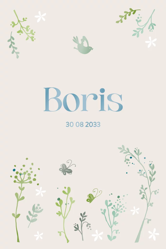 Een stijlvolle mooie staand geboortekaartje met de naam en kleine bloemetjes en takjes in zachte kleuren in hoogglans gedrukt. Je kunt deze kaart zelf bewerken door jouw favoriete lettertype te kiezen en de kleuren aan te passen.