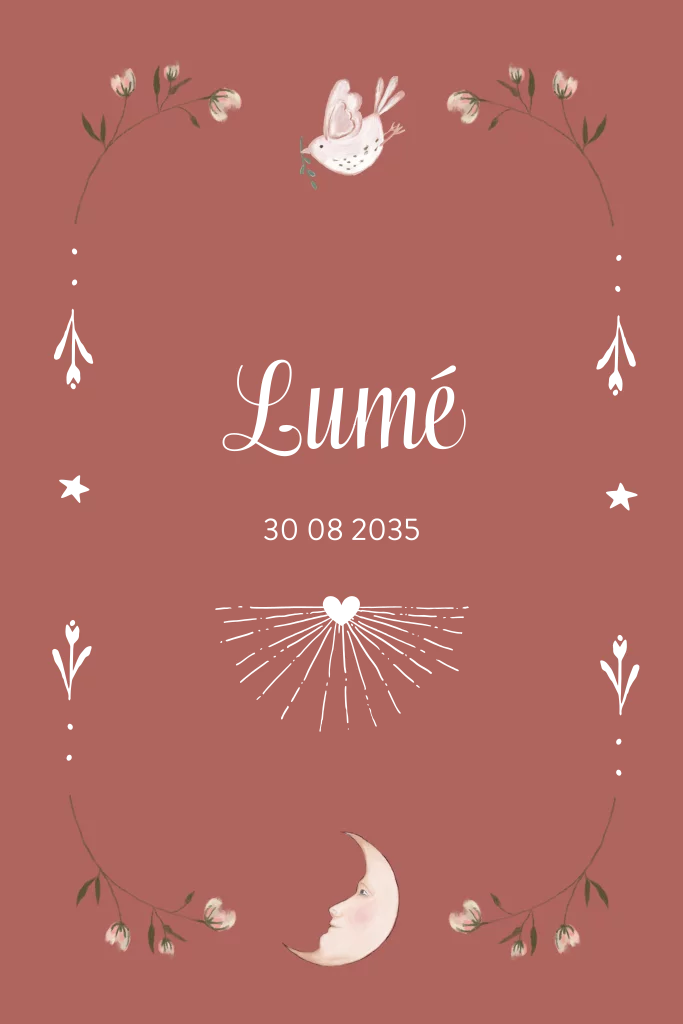 Bohemian geboortekaart met bloemen vogeltje en maan en foliedruk