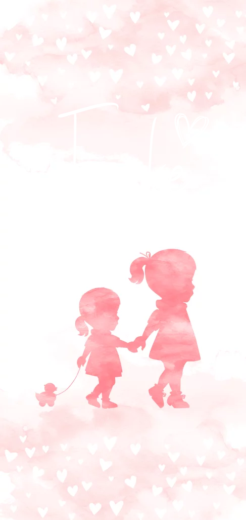 Langwerpige geboortekaart met waterverf silhouetten van twee zusjes hand in hand en de naam in Goudfolie, goudfoliedruk.
