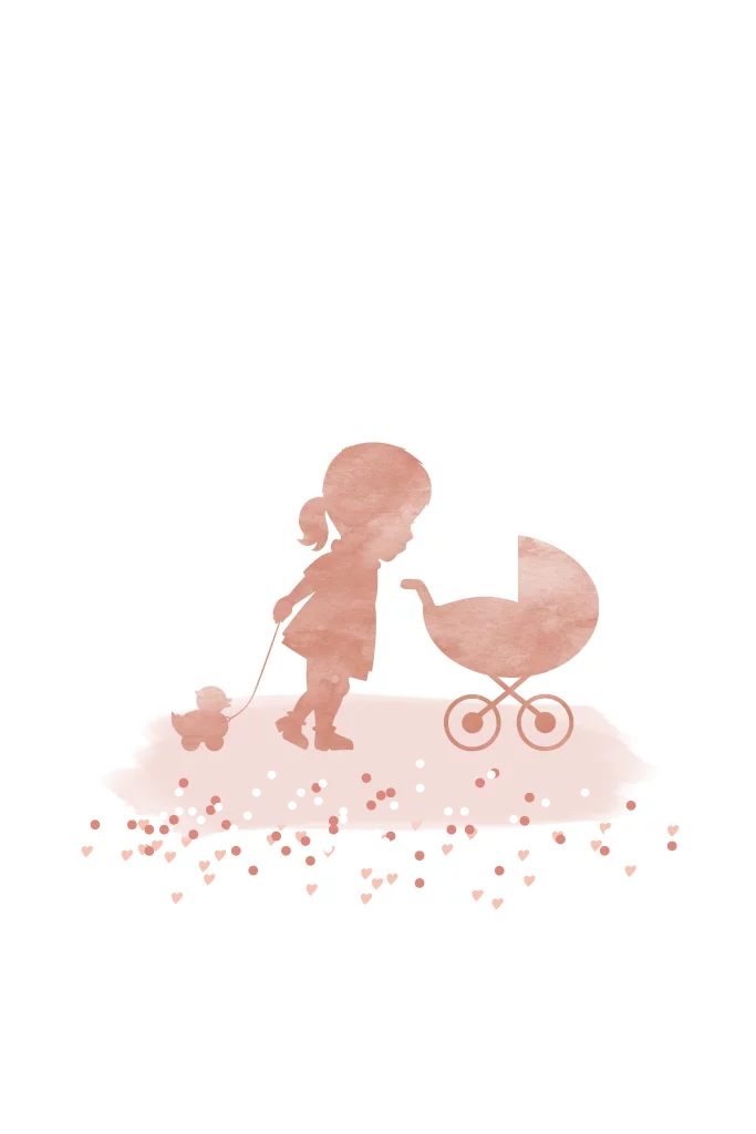 Hip goudfolie geboortekaartje met een silhouet van zusje met een kinderwagen, een waterverf streep en confetti van hartjes en stipjes die je zelf een andere kleur kunt geven.