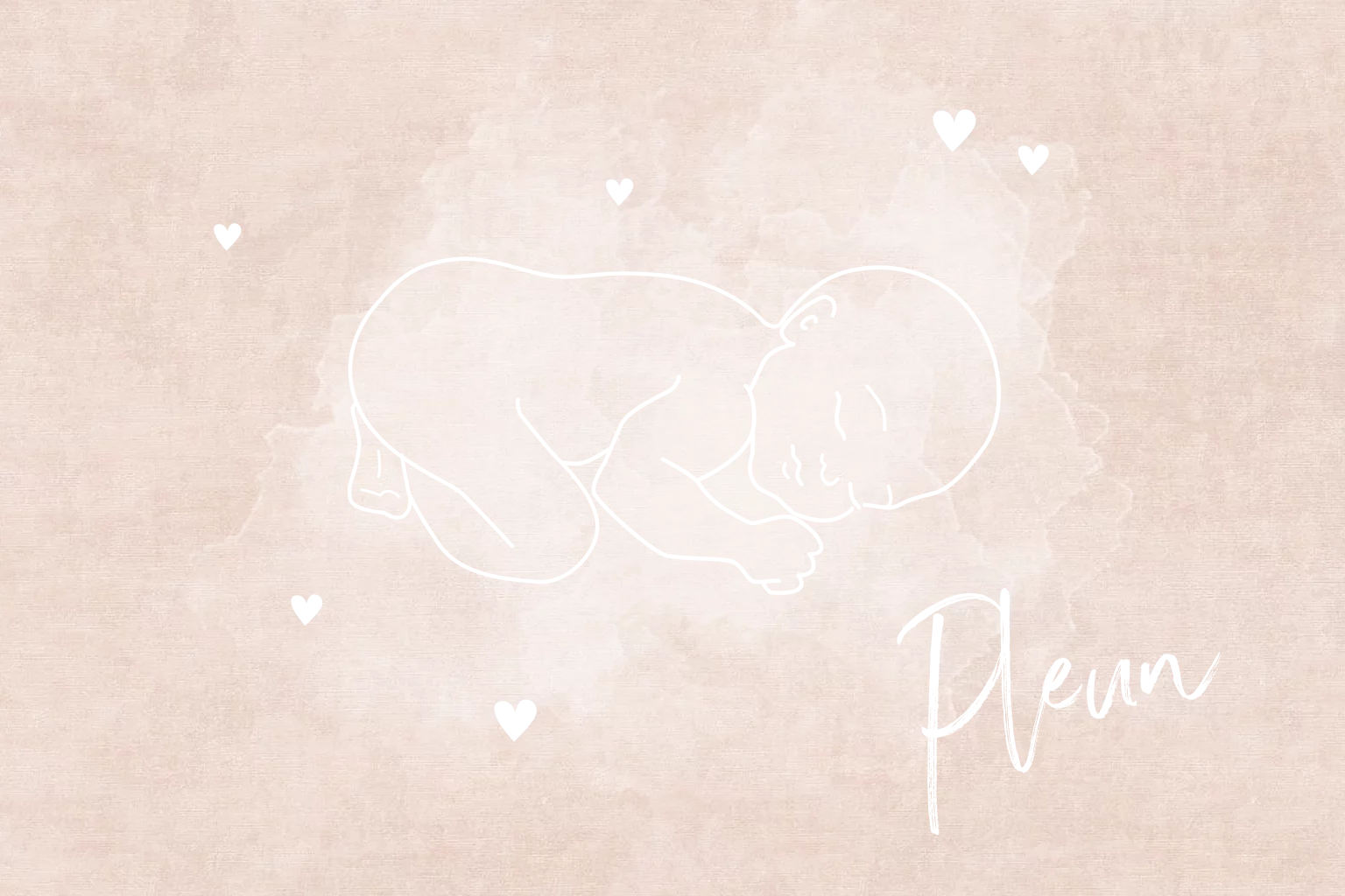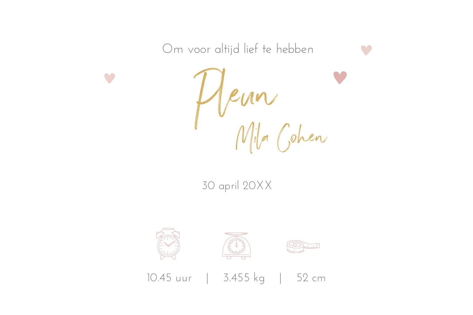 Prachtige folie geboortekaart met een silhouet van een baby in outlines en de naam en hartjes in sprankelend folie op een velvet achtergrond.