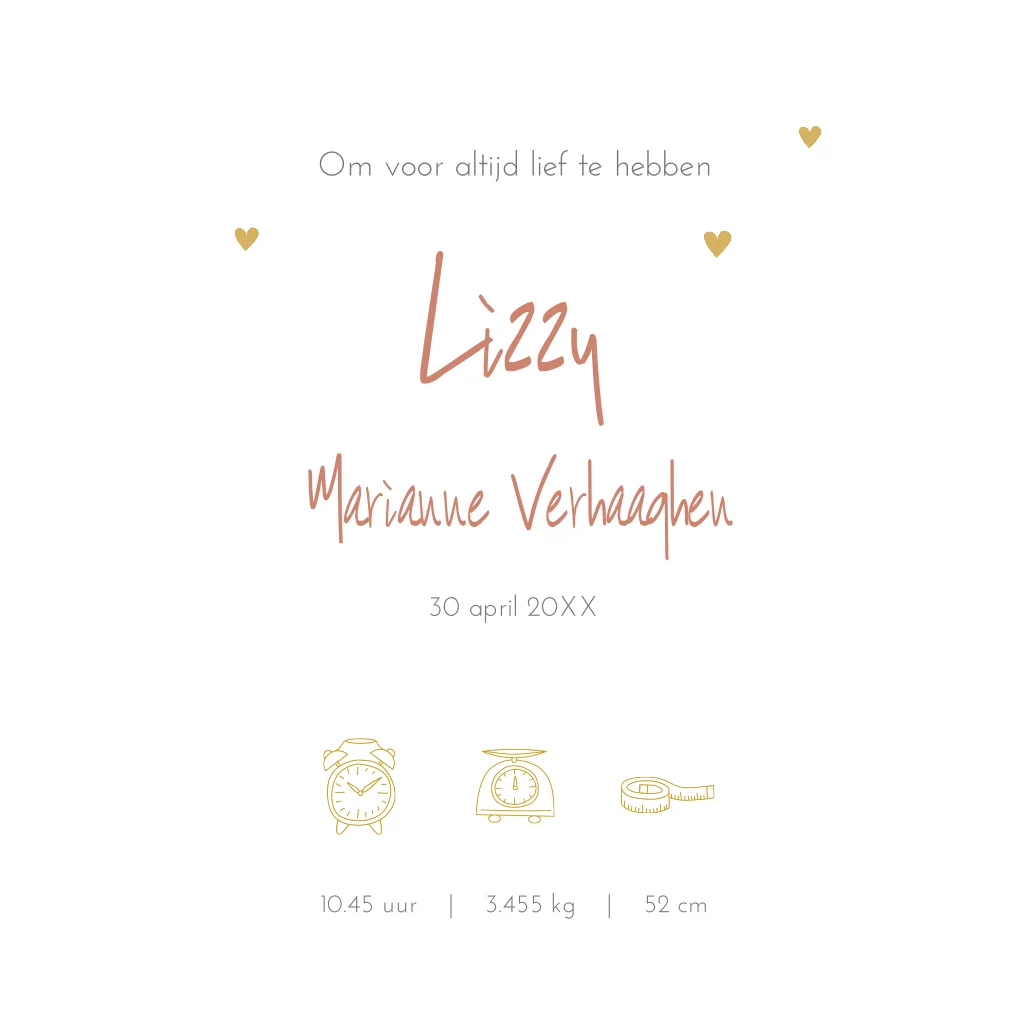 Prachtige zachte gouden foliedruk geboortekaart met de naam en hartjes in sprankelend folie en een velvet roestkleurige achtergrond.