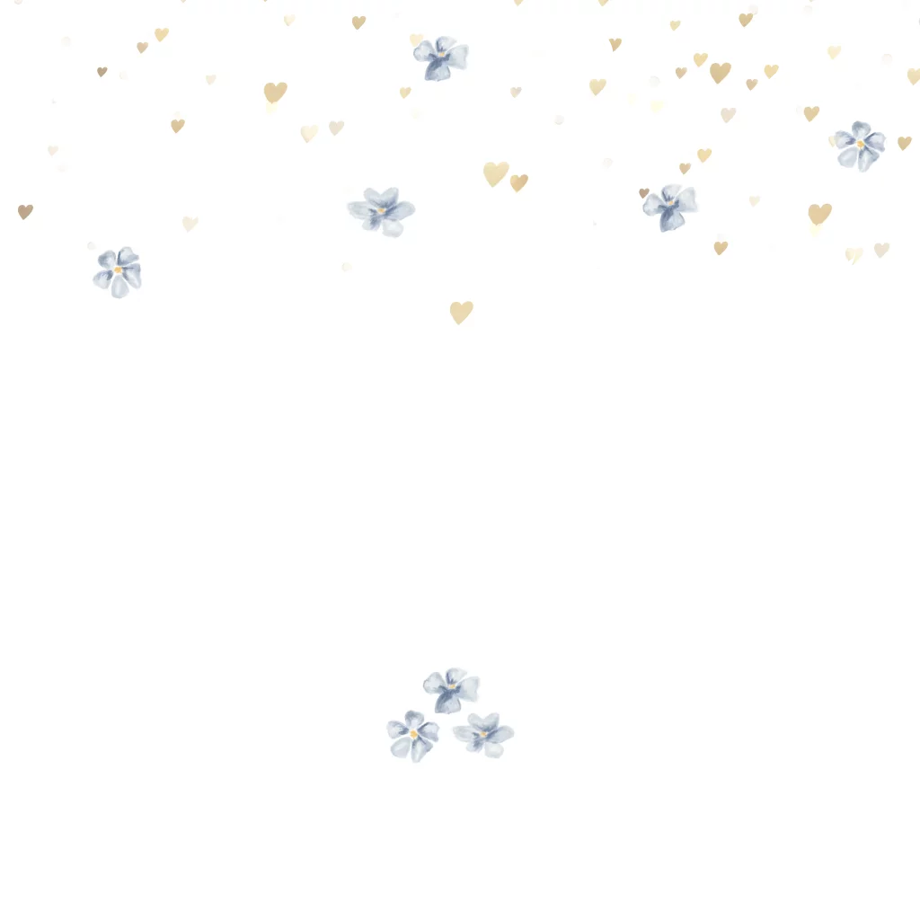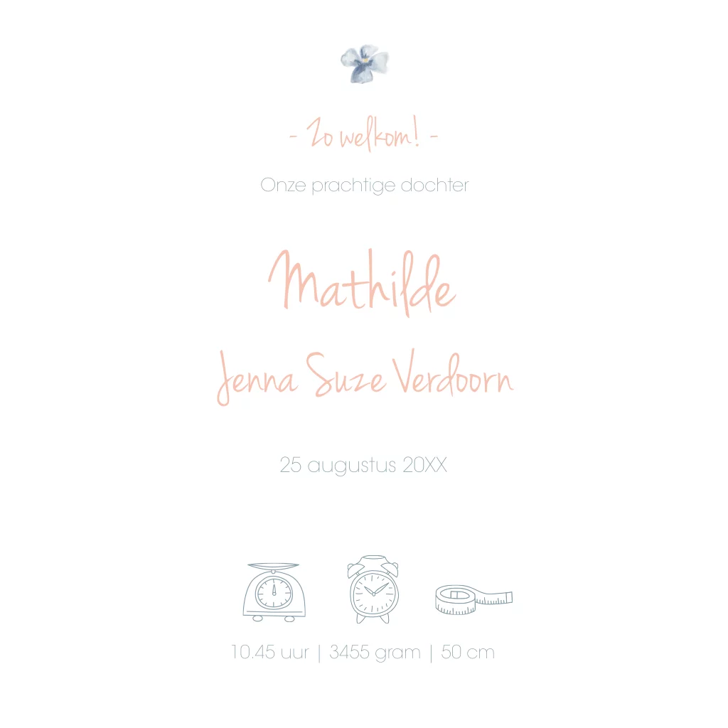 Mooie waterverf bloemetjes en hartjes dwarrelen over dit geboortekaartje heen met de naam van jullie kindje in echt rosé foliedruk.