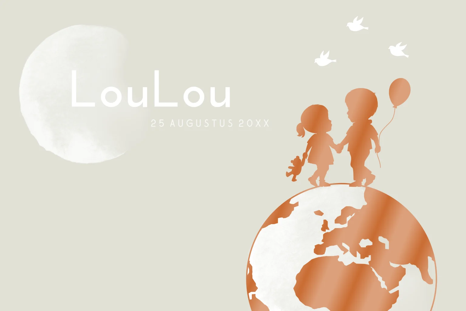 Hippe liggende geboortekaart met silhouetten van broertje en zusje op de wereldbol gedrukt met hoogglans lak in een roest bruine kleur
