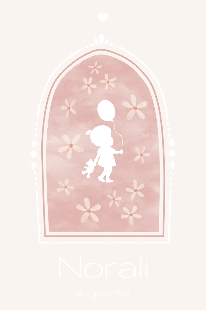 Mooie staande geboortekaart met foliedruk en een lief silhouet van een meisje in een kader van waterverf en bloemetjes en een randje van goudfolie wat een sjieke uitstraling geeft.