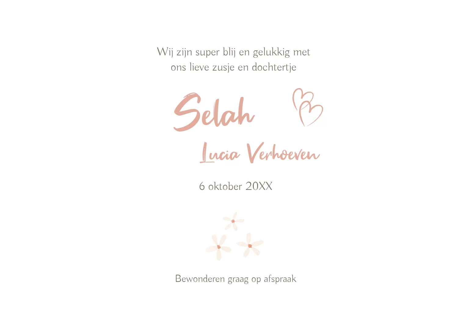 Geboortekaartje met rosé foliedruk en kleine handgeschilderde bloemetjes in pastelkleuren. Pas zelf de kleuren en teksten aan of zet om in koperfolie, zilverfolie of goudfolie.