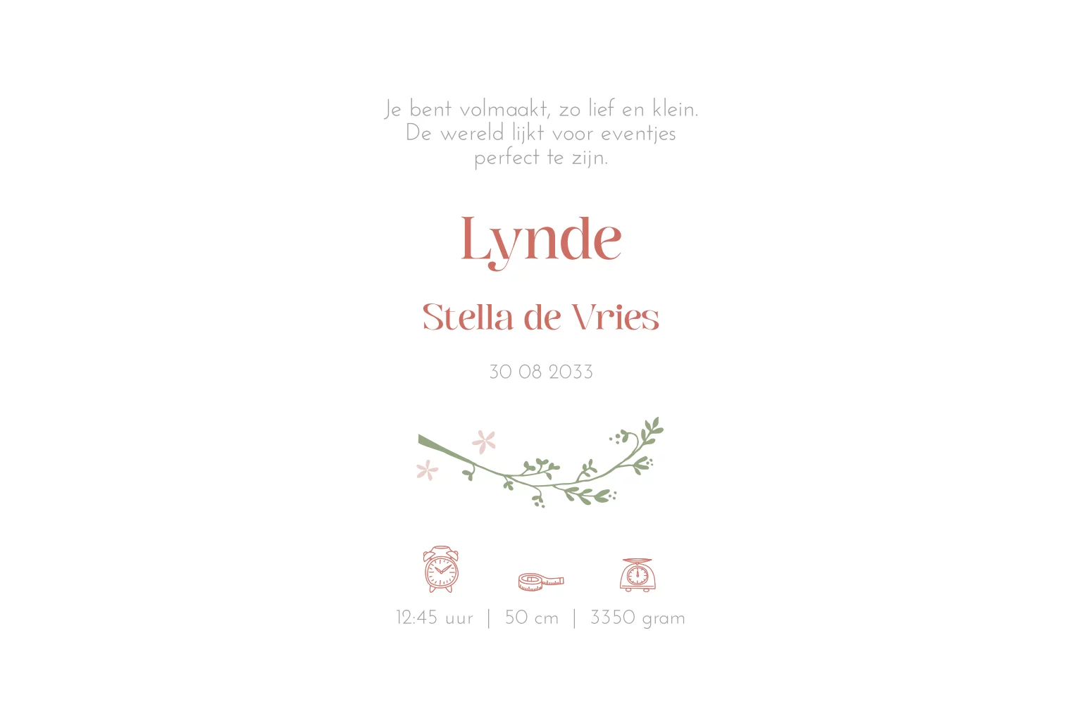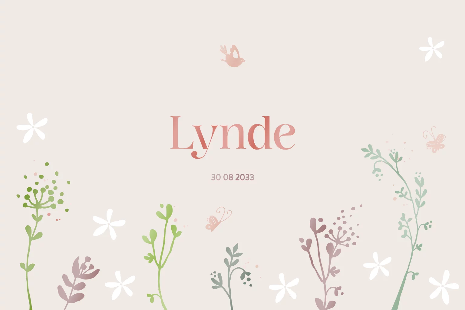 Een stijlvol en schattig geboortekaartje met de naam en kleine bloemetjes en takjes in zachte kleuren in hoogglans gedrukt. Je kunt deze kaart zelf bewerken door jouw favoriete lettertype te kiezen en de kleuren aan te passen.