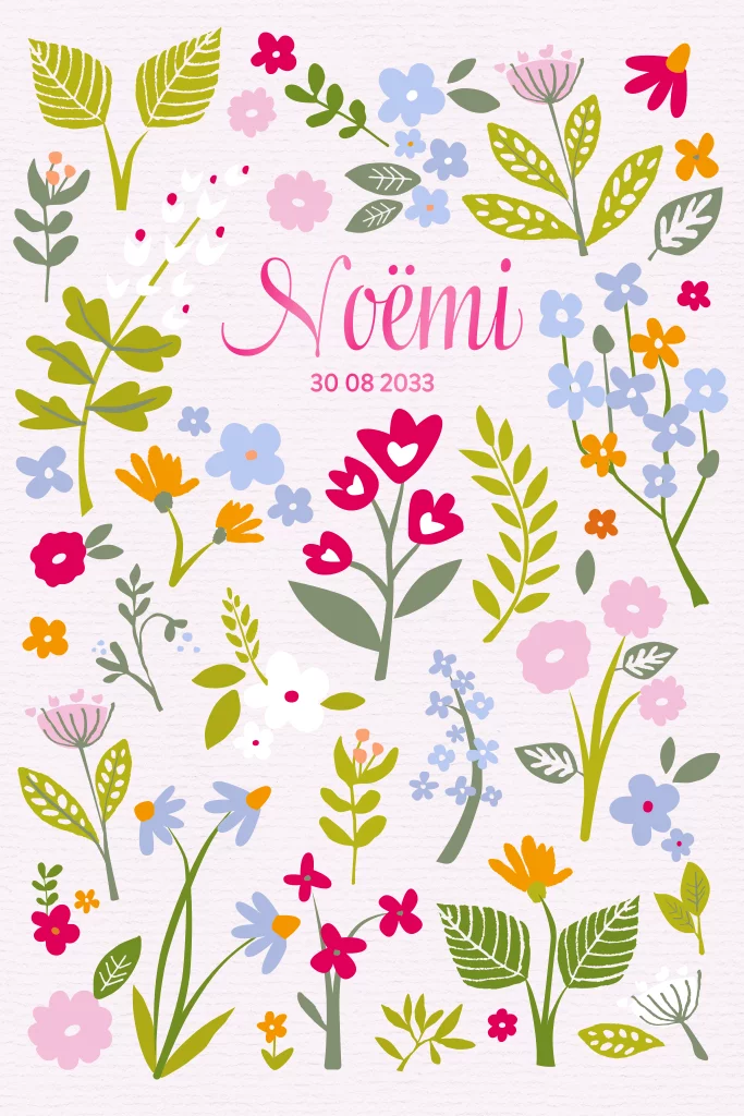 Hippe staande meisjeskaart met de naam in hoogglans tussen vrolijke bloemetjes in verschillende kleuren.