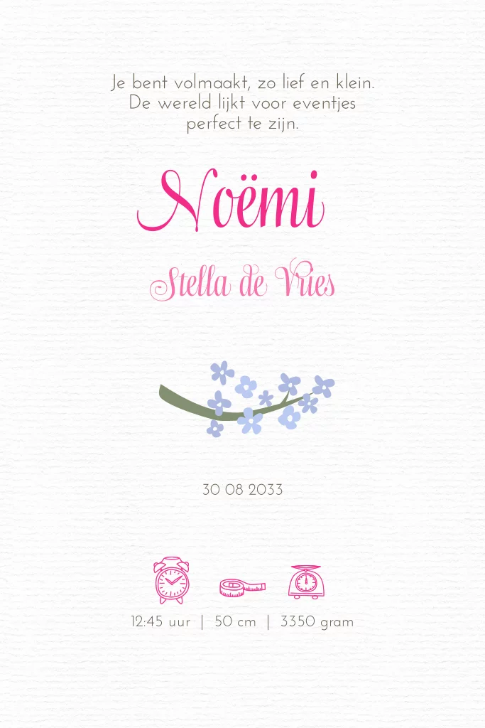 Vrolijke geboortekaart met kleurrijke bloemetjes en hoogglans