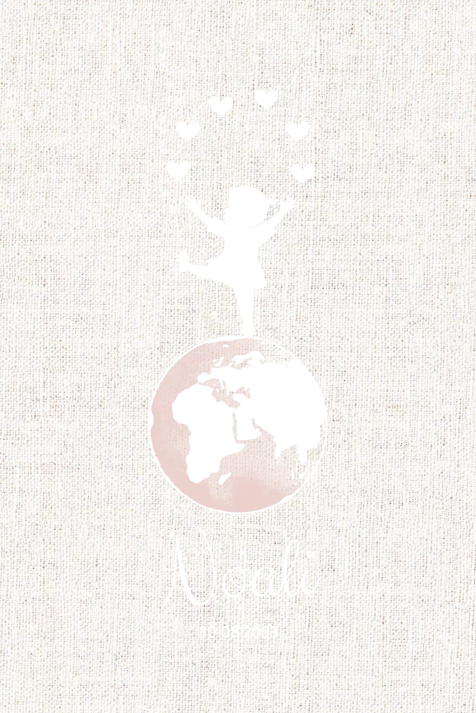 Mooie staande geboortekaart met foliedruk en silhouet van een meisje op de wereldbol op een linnen-look achtergrond.