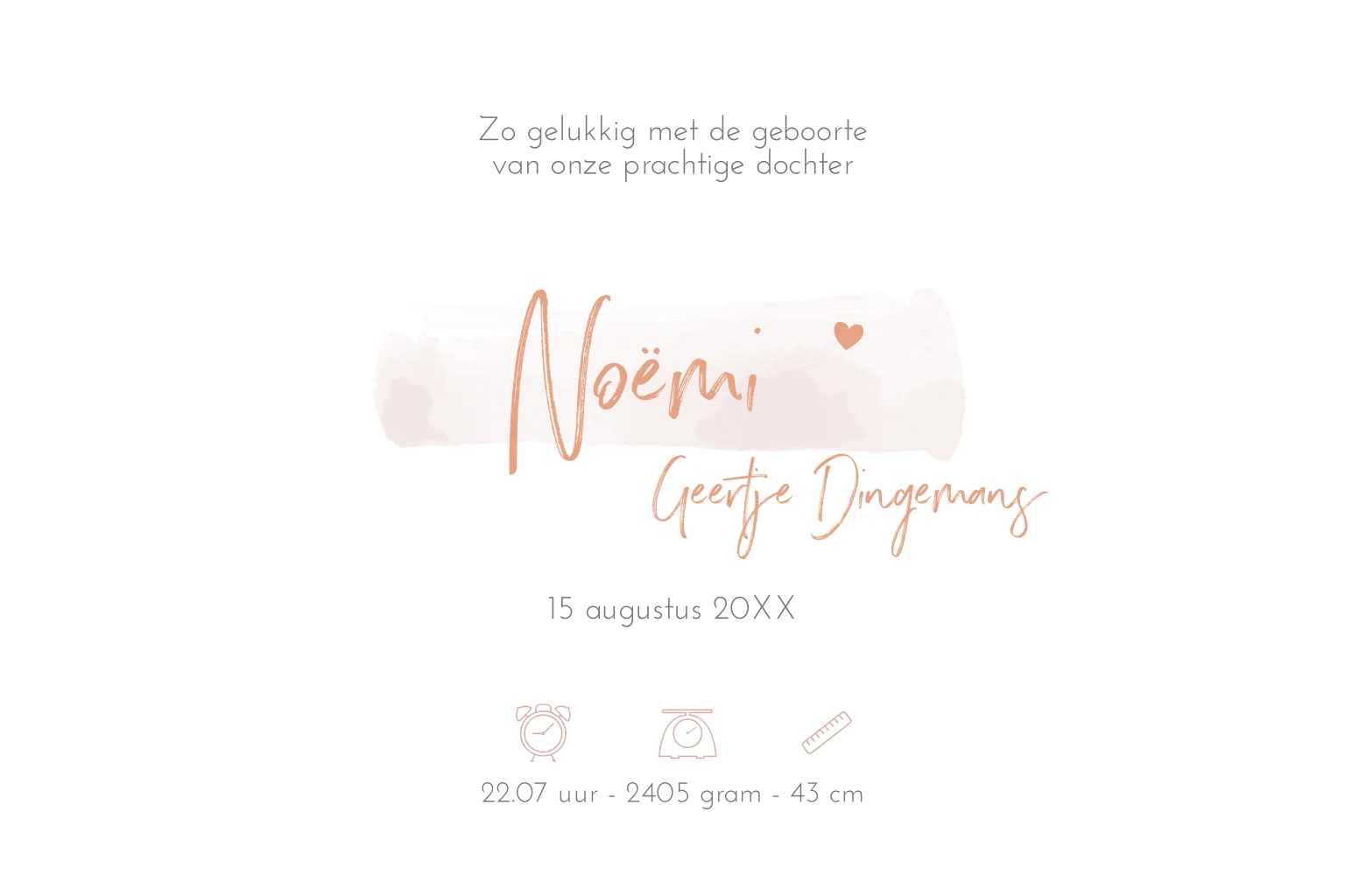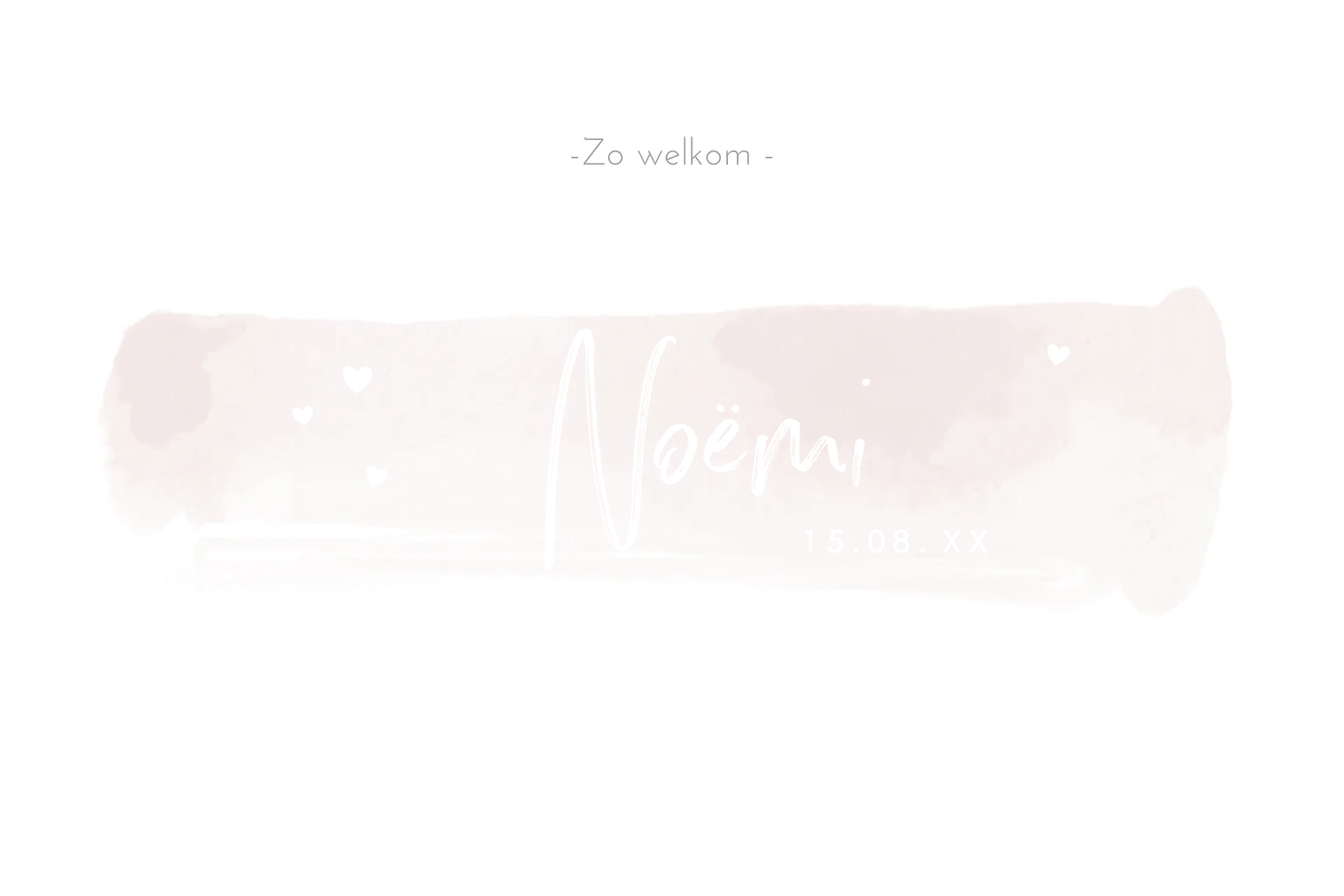 Modern geboortekaartje met foliedruk op waterverf streep met de naam en kleine folie hartjes op een aquarel veeg op de achtergrond. Pas eenvoudig zelf de kleuren en teksten aan van dit babykaartje of zet om naar goudfolie holografische folie of zilverfolie.
