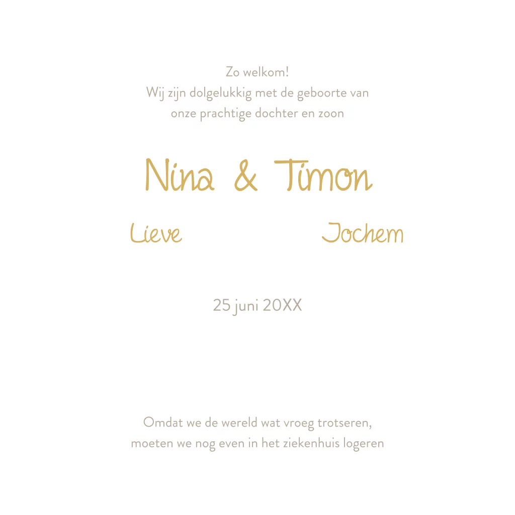 Mooie kaart voor een tweeling met de silhouetten van twee kindjes hand in hand gedrukt in goudfolie. Deze kaart kun je eenvoudig aanpassen naar twee meisjes of twee jongens. Gebruik hiervoor een ander silhouet uit onze beeldbank en verander de kleuren of de goudfolie naar eigen idee.