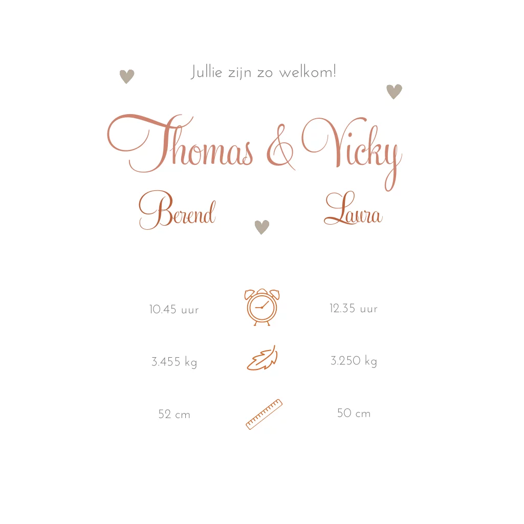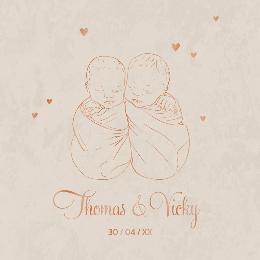 Prachtige geboortekaart voor een tweeling met een lieve illustratie, kleine hartjes en lijntekening van een tweeling. Pas deze tweelingkaart met hoogglans illustratie eenvoudig aan naar zilverfolie of goudfolie.