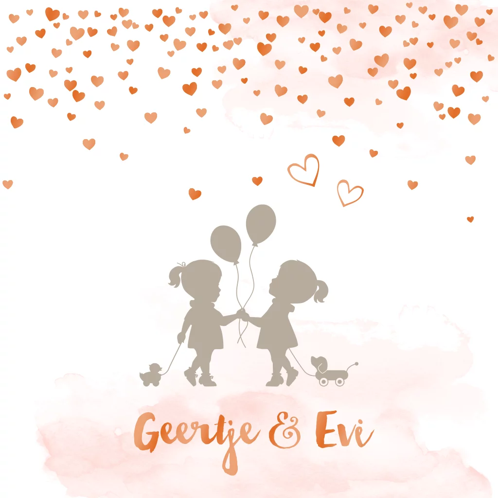 Tweelingkaart met silhouet meisjes en hartjes regen in foliedruk