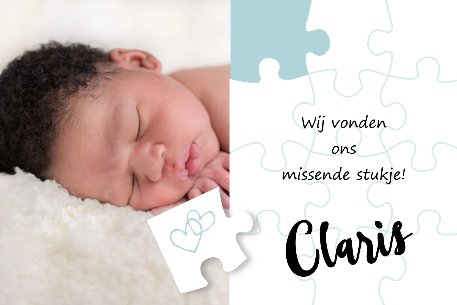 Lief adoptiekaartje met puzzel en foto voor een jongetje.
