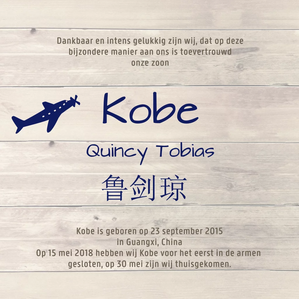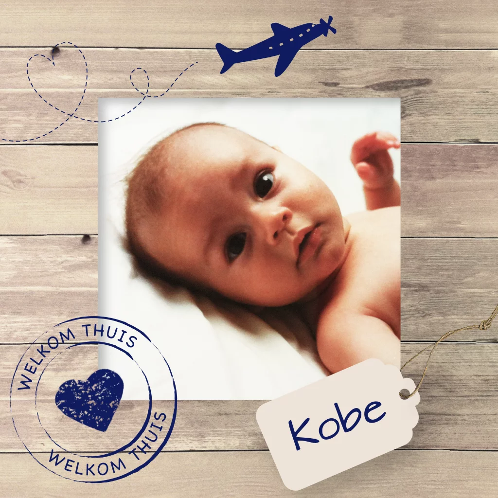Mooi aankomstkaartje Kobe met steigerhout en hippe stempels en vliegtuigjes voor jongen. Op de voorkant een stempel in twee kleuren met Welkom Thuis, kleur zelf de stempels. Originele stoere foto - aankomstkaart voor jullie zoontje met leuke details. Adoptiekaartje met foto, vliegtuig en etiket om zelf maken van JilleJille.nl