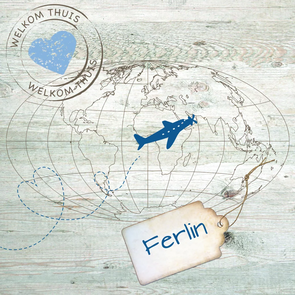 Mooi aankomstkaartje met steigerhout en hippe stempels en vliegtuigjes voor jongen. Op de voorkant een stempel in twee kleuren met Welkom Thuis, kleur zelf de stempels.