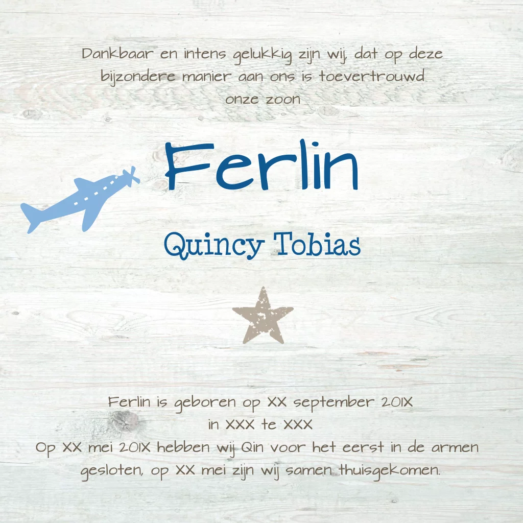 Stijlvol geboortekaartje voor jongen met hout en vliegtuigje