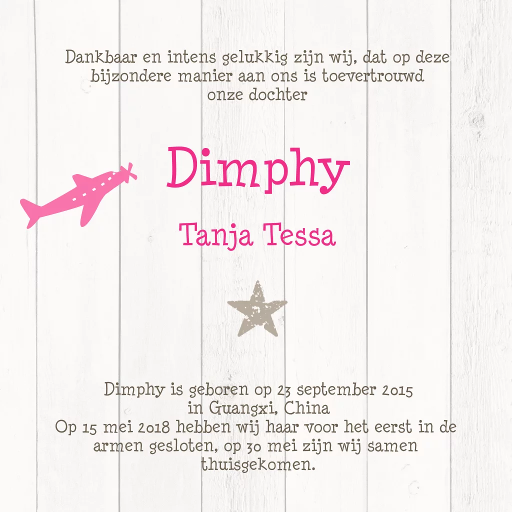 Mooi aankomstkaartje Dimphy met wit steigerhout en hippe stempels en vliegtuigjes voor meisje. Op de voorkant een stempel in twee kleuren met Welkom Thuis, kleur zelf de stempels. Origineel stoere aankomstkaart voor jullie lieve dochtertje met leuke details. Adoptiekaartje zelf maken bij JilleJille.nl