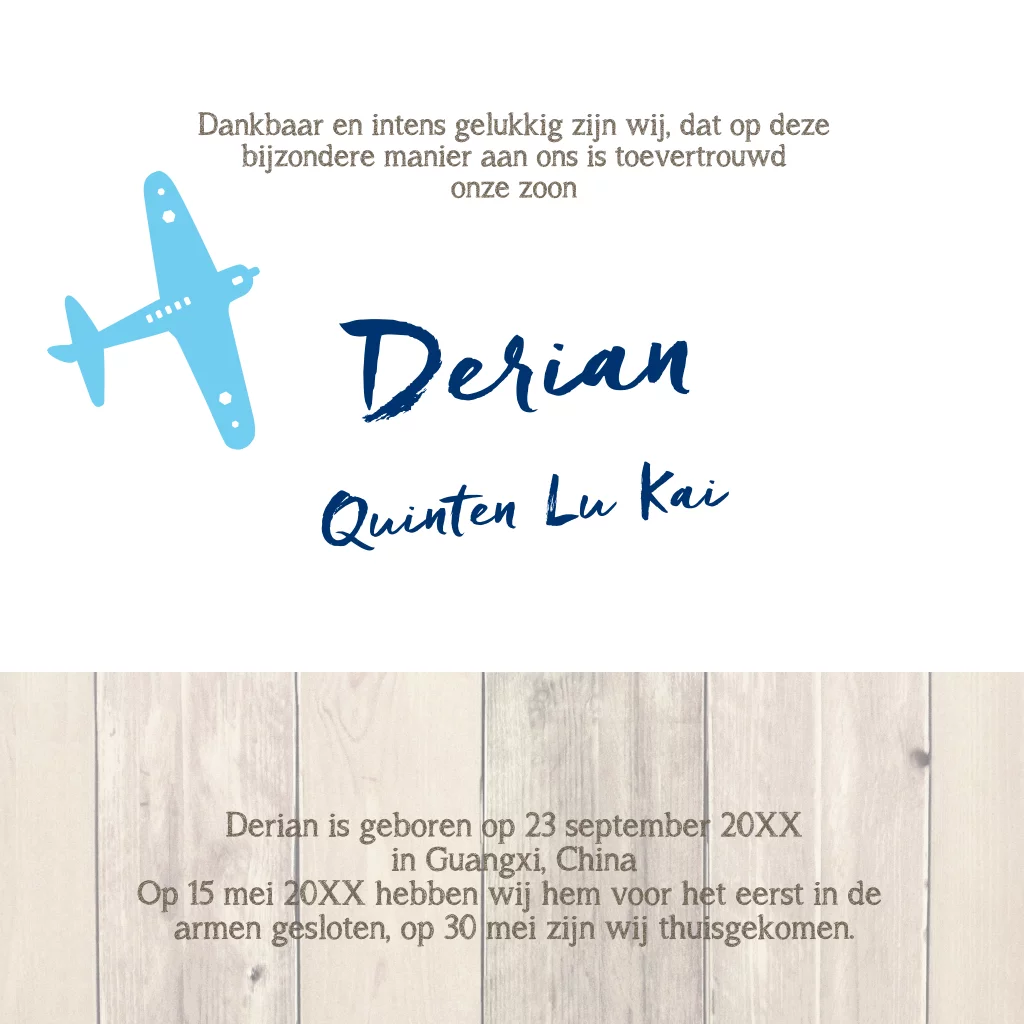 Lief adoptiekaartje voor jongen met steigerhout en vliegtuig