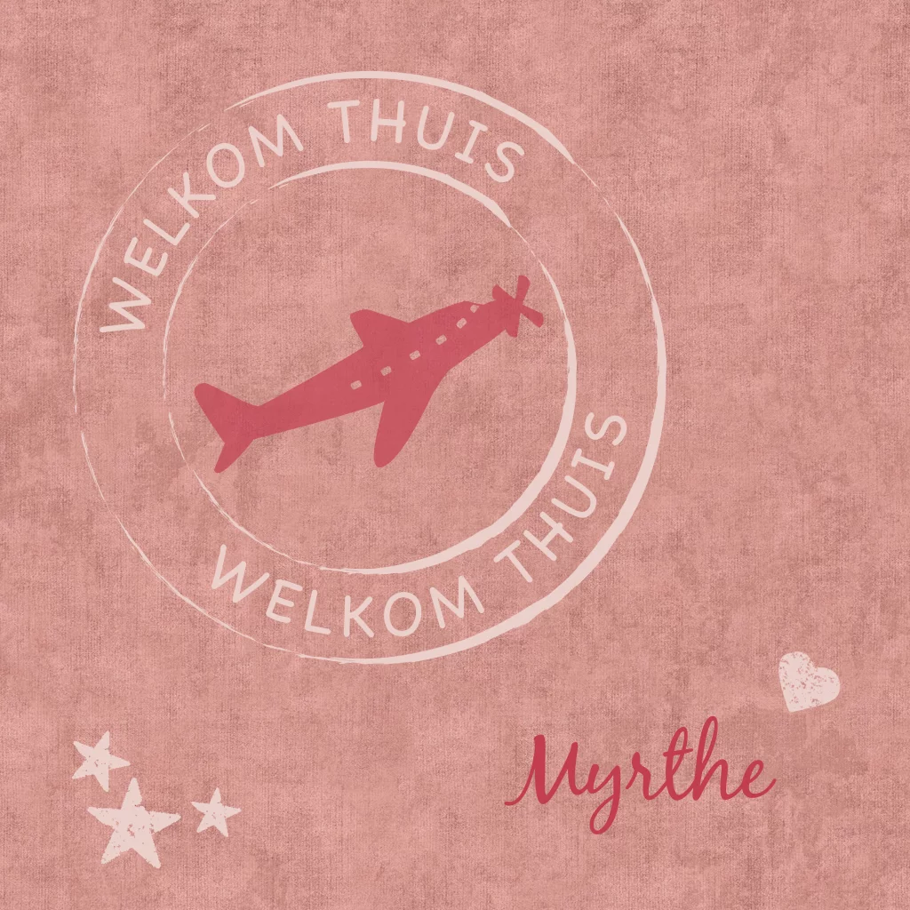 Mooi aankomstkaartje Myrthe met velvet achtergrond en vliegtuigje voor een meisje. Op de voorkant een stempel in twee kleuren met Welkom Thuis, kleur zelf de stempels. Originele mooie vintage aankomstkaart voor jullie kindje met leuke details. Adoptiekaartje met vliegtuigje met de naam van JilleJille.nl