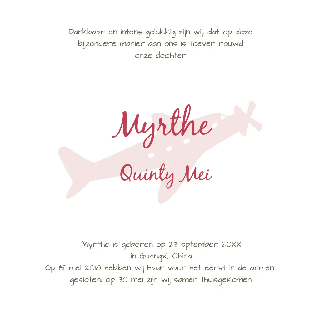 Lief adoptiekaartje voor meisje met vliegtuig en stempel