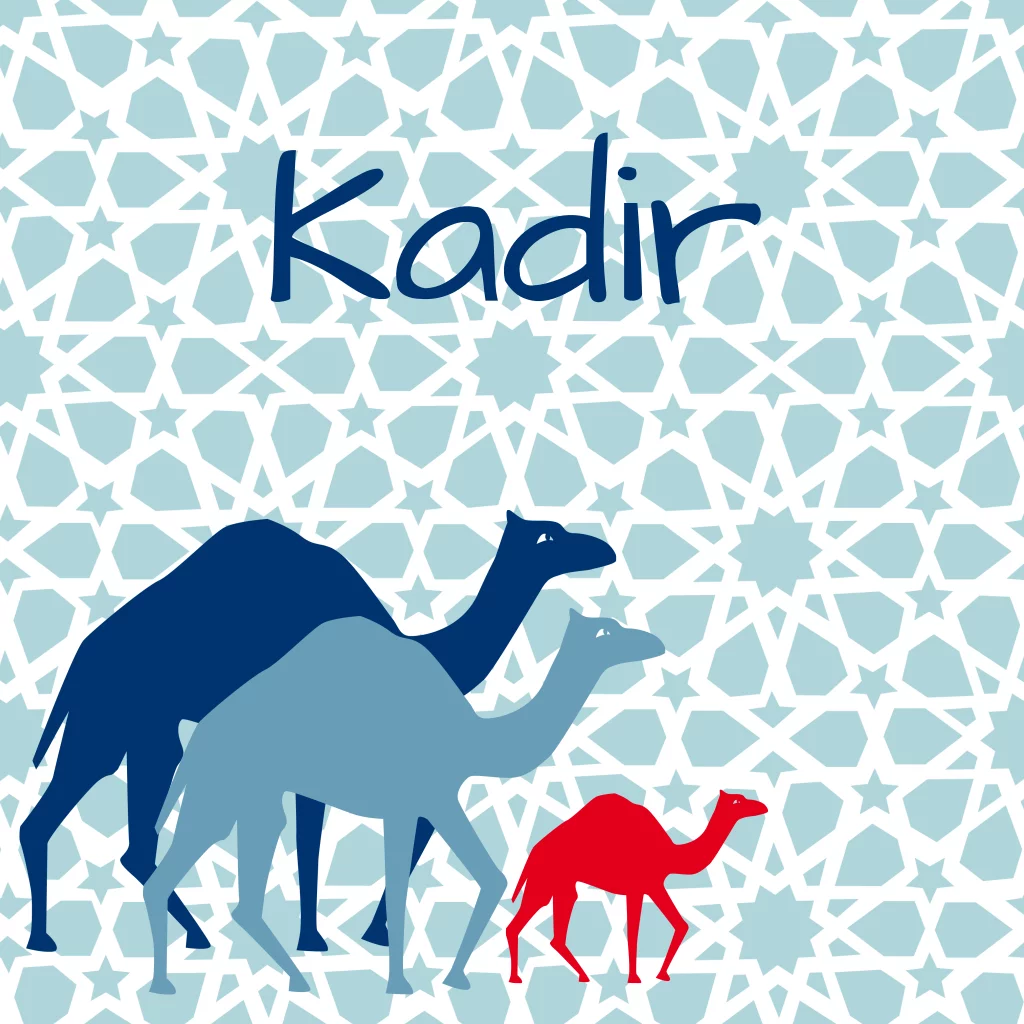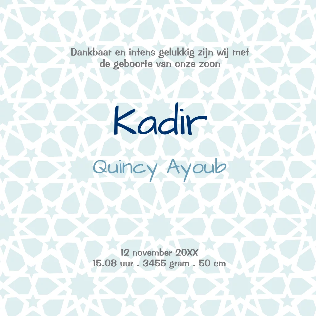 Mooi geboortekaartje Kadir met oosters, arabisch dessin en kamelen voor jongen. Originele stoere geboortekaart voor jullie zoontje met leuke kameel. geboortekaart met oosterse, arabische details en elementen om zelf maken van JilleJille.nl