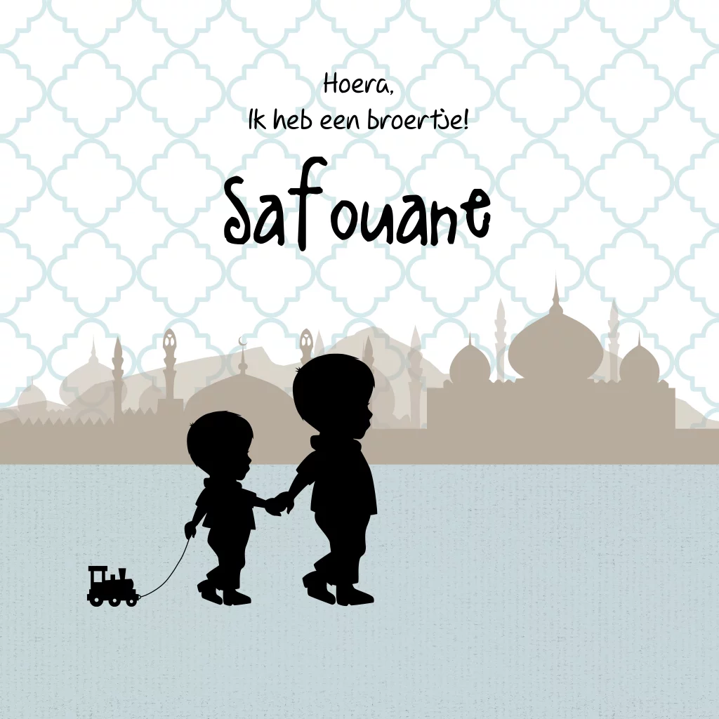 Mooi geboortekaartje met oosters, arabisch dessin en skyline met silhouet voor jongen, broertjes broertjes.